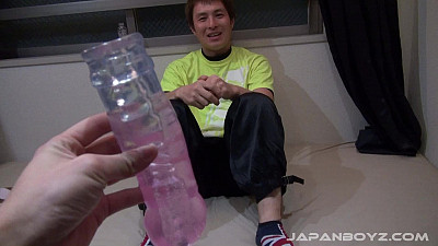 After taking off his underwear, he strokes his cock and I suggested he use the cock sleeve and some lube. When he grabbed the lube, it actually came out faster than he expected and wound up with a "glob" all over himself and the bed. All I could think was "a little dab'll do ya." Sliding on the cock sleeve, Musashi needs know instructions on what to do with it. After a while, the cock sleeve served its purpose and time to get down to business and take matters into his own hands.