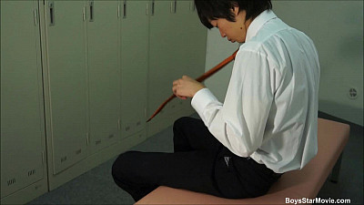 With a key to the workout room, we know this “kaishain” or intern has done his best at working hard. Our boy has got a few minutes to relax and “blow” off some steam. Working himself up, the idea of a hard job, is right at hand. Pulling out his phone, he stretches out and gets to it, as we enjoy his think frame. With his ball sack swelling and stiffening, this sexy boy cums with two “shoestrings” hanging down nicely, off his well worked dick.