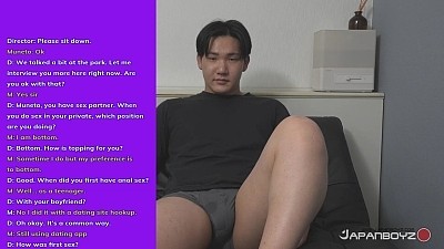 After an initial interview outside in the Tokyo sunshine, the director invites Muneto in to finish with some more direct questions in his studio. Then Muneto gets down to business with his big cock, and other sexy parts. His lush booty is so inviting the director can't help lending a hand, and a few fingers. The stimulation reaches a peak and Munteo shows his mettle with a big splashy volley of cum spurts. Welcome to the Japanboyz gang, Muneto. We think you'll be right at home here.
