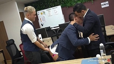 Asian office workers have a reputation for being bored and horny. Married executives use the rush hour traffic as an excuse to get some on the side at a love hotel or gay bathhouse. Here we have Japanboyz fan faves Reach and Gal leading two of their office buddies in a scorching fourway, slowly taking off button-down shirts, ties and dress pants to bang their balls into hot hungry holes. Reach gets all the cock as the three workingmen surround him and feed him dick from both ends. Fans of guys in suits will pop their wads watching these four studs taking a clandestine break from their workaday drudgery to fuck, suck, rim and finger their comrades. Splashes of juicy man juice fly and Reach ends up drenched from face to chest to hairy crack. These Japanese guys know how to make their break time FUN!