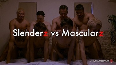 Here we get to see the culmination of all those fourway love-team battles when the full group of Japanboyz' hottest - the Slenderz gang of Darou, Kazuto, Ruito and Yu offer up their mouths and booties to the big hard Muscularz muscle studs, Ryuji, Rio, Kosuke and TonTon. It starts out as a moving writhing tableau of dick swallowing, with the four muscle gods standing erect and getting their gonads gobbled by the hungry and excited bottom boyz. Before long that shifts to a four-couple "line dance" with the dick-starved bottoms getting their asses railed doggy-style, each Slenderz stud on hands and knees taking it from a matching Muscularz dick-slinger. As you might expect and were definitely hoping for, it heats up to a parade of flying and splattering cum from top and bottom alike, the epic end to this five-episode group fuck to top anything you've been dreaming of.