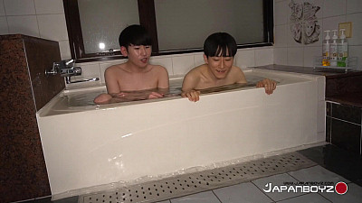When two hot sporty Japanese guys doff their long yukata robes and strip down to the completely bare essentials, you know we're in for a hot time. Tall, slim and pale, Uzin is the new boy. Akira is the experienced veteran Japanboy who gets to try Uzin on for size. Naked and getting horny already, they climb into a hot deep bath, which immediately splashes and overflows onto the tile floors. These naughty boys don't care, barely notice when they start making out. Uzin stands and Akira gives his stiff cock a long tender tongue job. The new boy's hairless from the neck down, and Akira is turned on by his smooth new buddy.