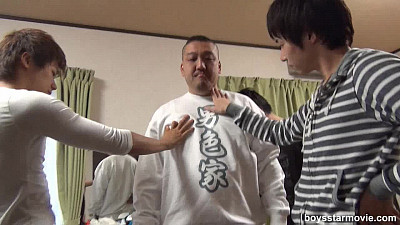 Toraemon heads up a group of young Japanese twinks that are all set to have their way with a Japanese daddy dressed in a sling type jock strap. They play with his nipples and massage his cock before they bring out an assortment of toys including anal vibrators that they use on his nipples and Toraemon brings out a device even I've never seen. It's battery operated, has a cup on the end that is inserted over the head of daddies cock and Toraemon hits the on button. Our daddy is enjoying the attention for sure as we listen to his moaning and groaning. This is like a field trip without a teacher or guardian telling you what you can and cannot do. The boys are loving it! (and daddy too)