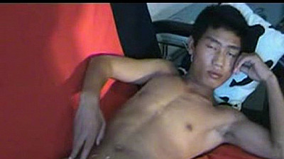 That bright orange couch really accentuates his velvety smooth Asian skin as he lies down comfortable getting ready to shoot his cum over his six packs.