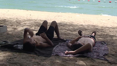 It's an all out Asian twink orgy fuck-a-thon! Jem and Ak are just laying on the beach in their sexy undies, dreaming about big cock. Fortunately for them, Yai comes home and offers up his big sausage to these hungry boys. They both fight for the cock but greedy Ak is the winner, taking that big long cock all the way down his throat. Jem sees this twink bending over, and he goes to town licking that sweet, smooth Asian asshole. He said he was a bottom but he has no problem getting rock hard and soon shoves his long curved Burmese dick up this Chinese slut's ass. Soon he's giving him a hot passionate fuck as Ak takes it in both holes. He can't wait for these uncut Asian dicks to give him a nice wet cum bath!