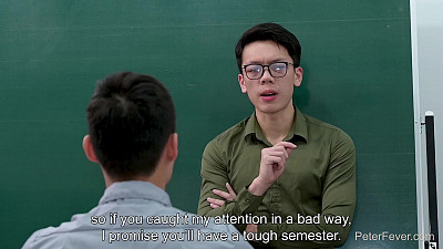"Yowei strides into class with a studly swagger, announcing that Mr. Duncan has taken off for this semester, and that HE won't be as easygoing. But he promises if the students stay on his good side they will earn a reward. The only student around today to hear this is handsome nerd Hen. Yowei compliments him on doing well on today's test, and offers up the promised reward. He unbuttons Hen's shirt and kisses him as he strips off his own. Next thing you know Hen's naked on the desk with Mr. Yowei between his legs.